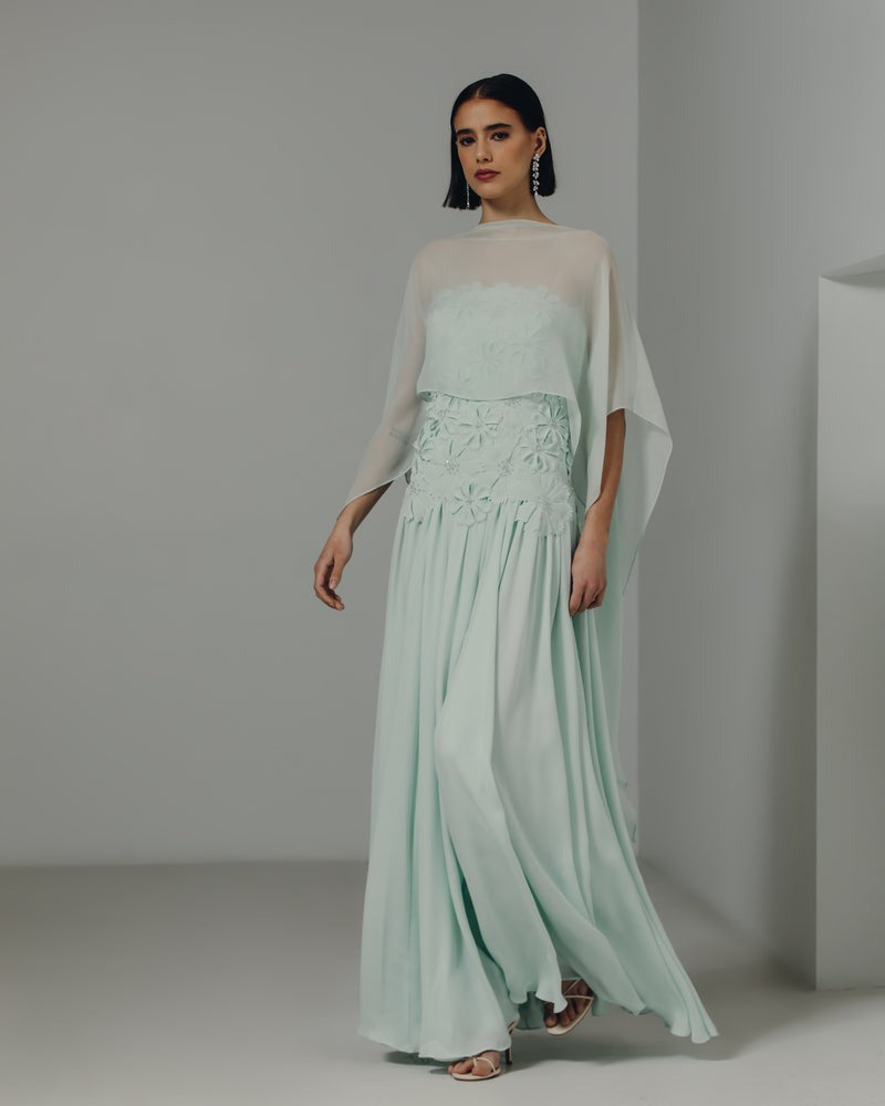 A sheer, lightweight cape-style overlay that drapes softly over the shoulders and upper bodice. *Rene Gown sold separately.