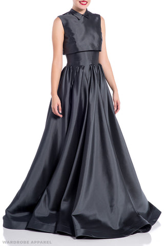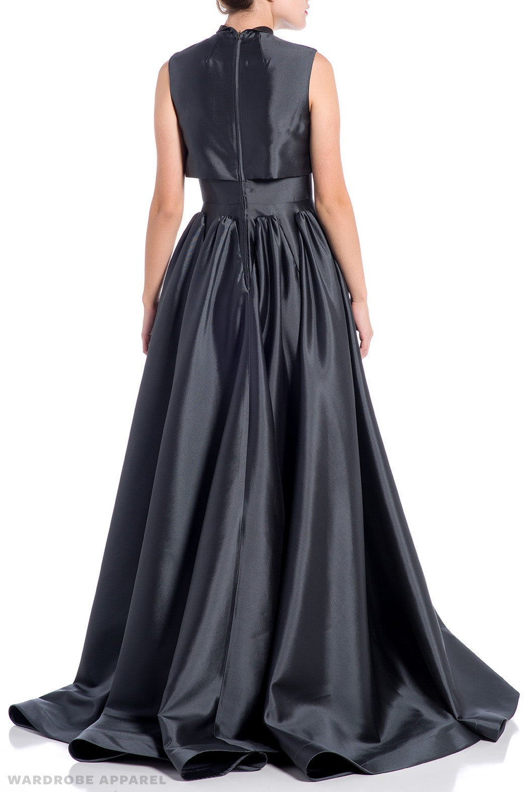 By Greta Constantine The Amory Gown gives the playful appearance of a two-piece set while remixing your concept of a gown. The top overlays the waist to accentuate the waist and the pleats at the waist give the gown volume from the top for an elegant flow.