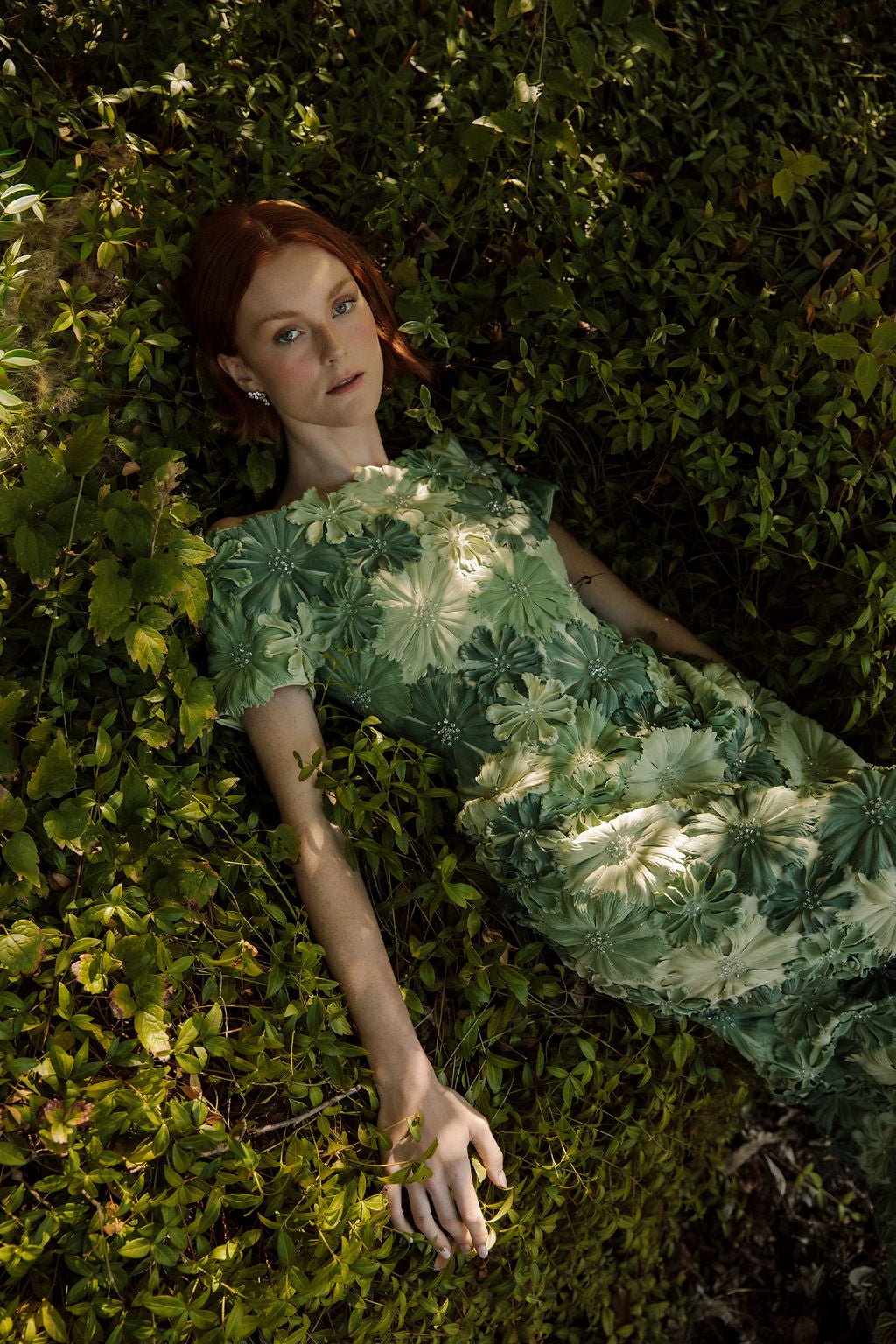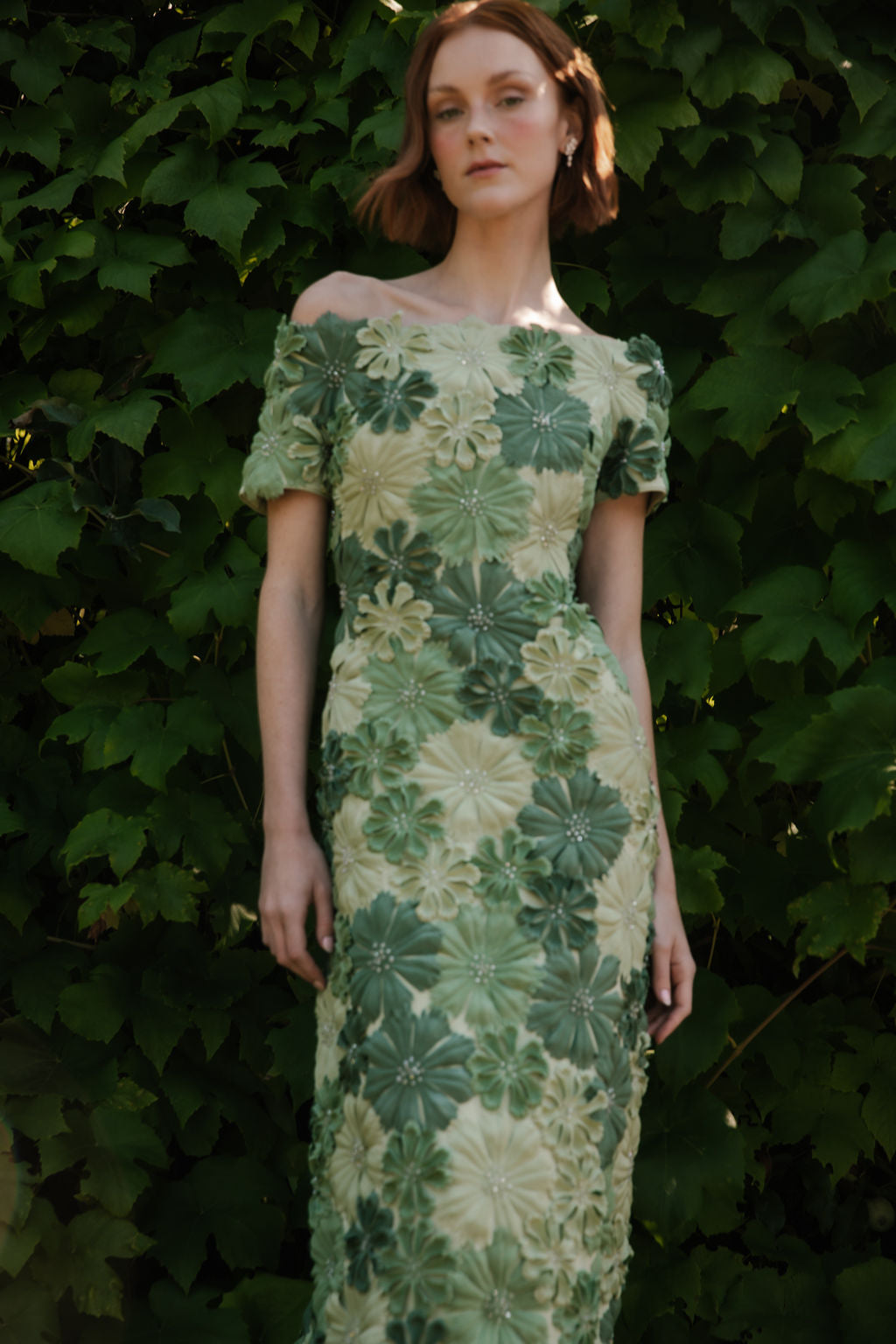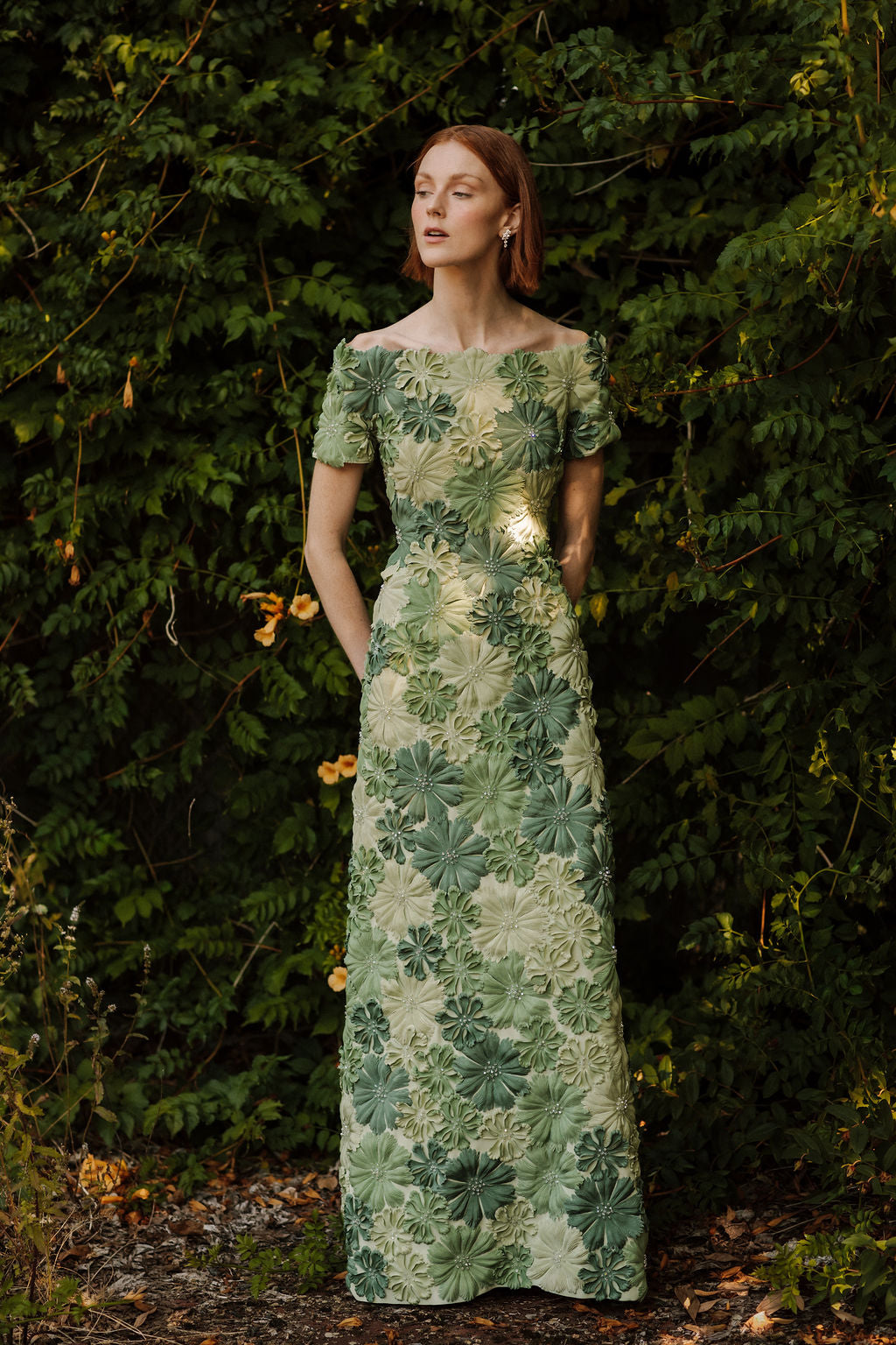 Off shoulder gown with hand-sewn petals and crystals.