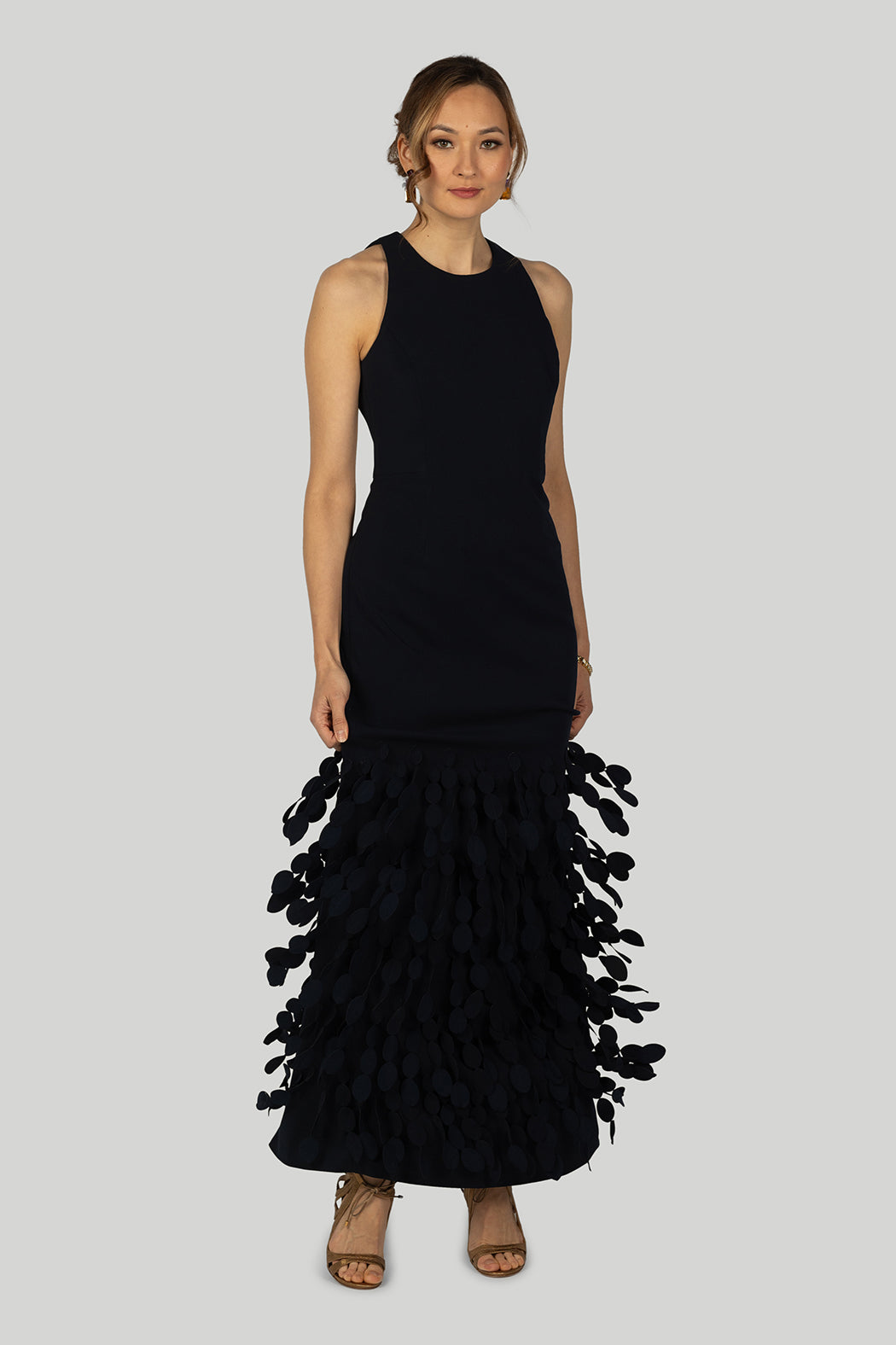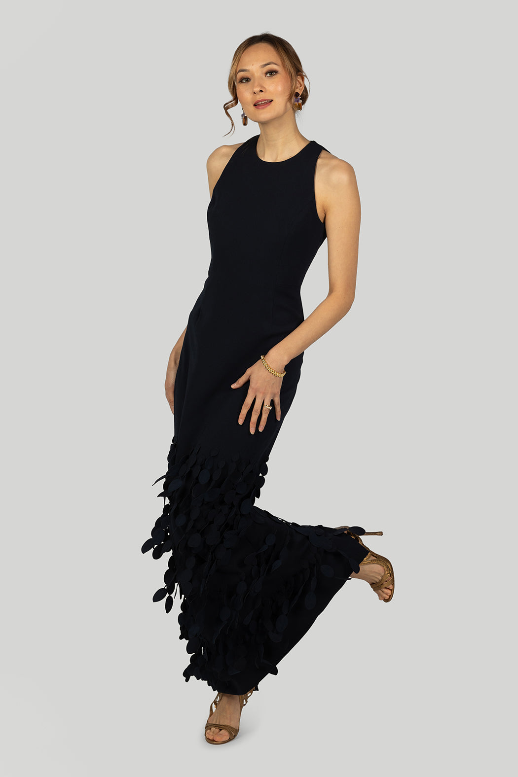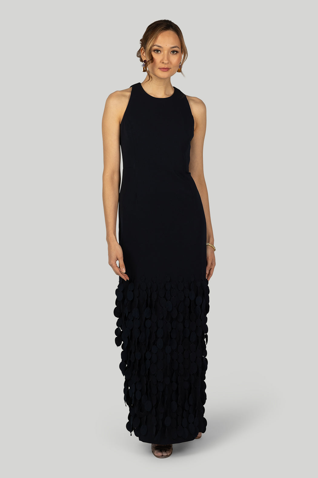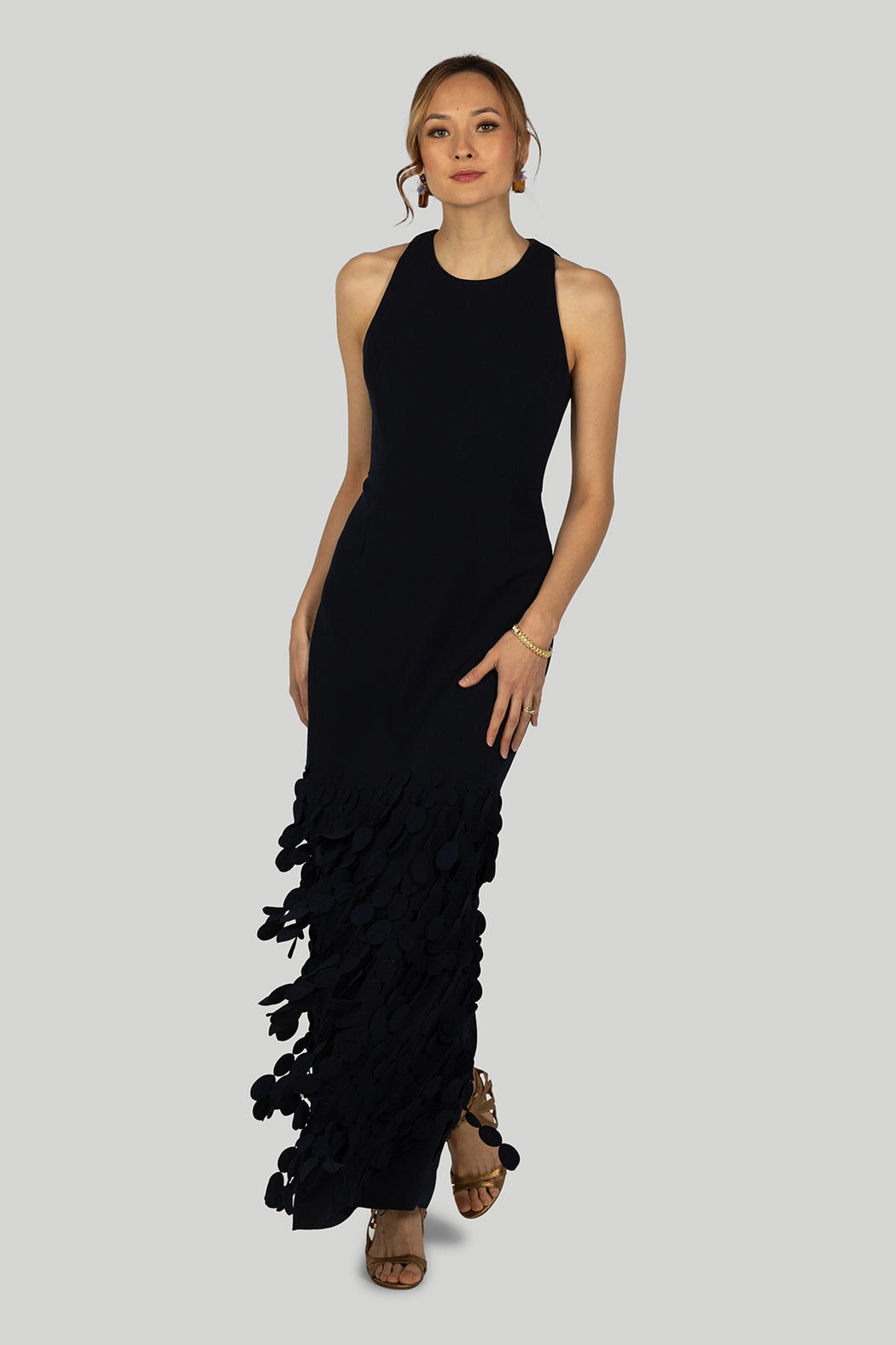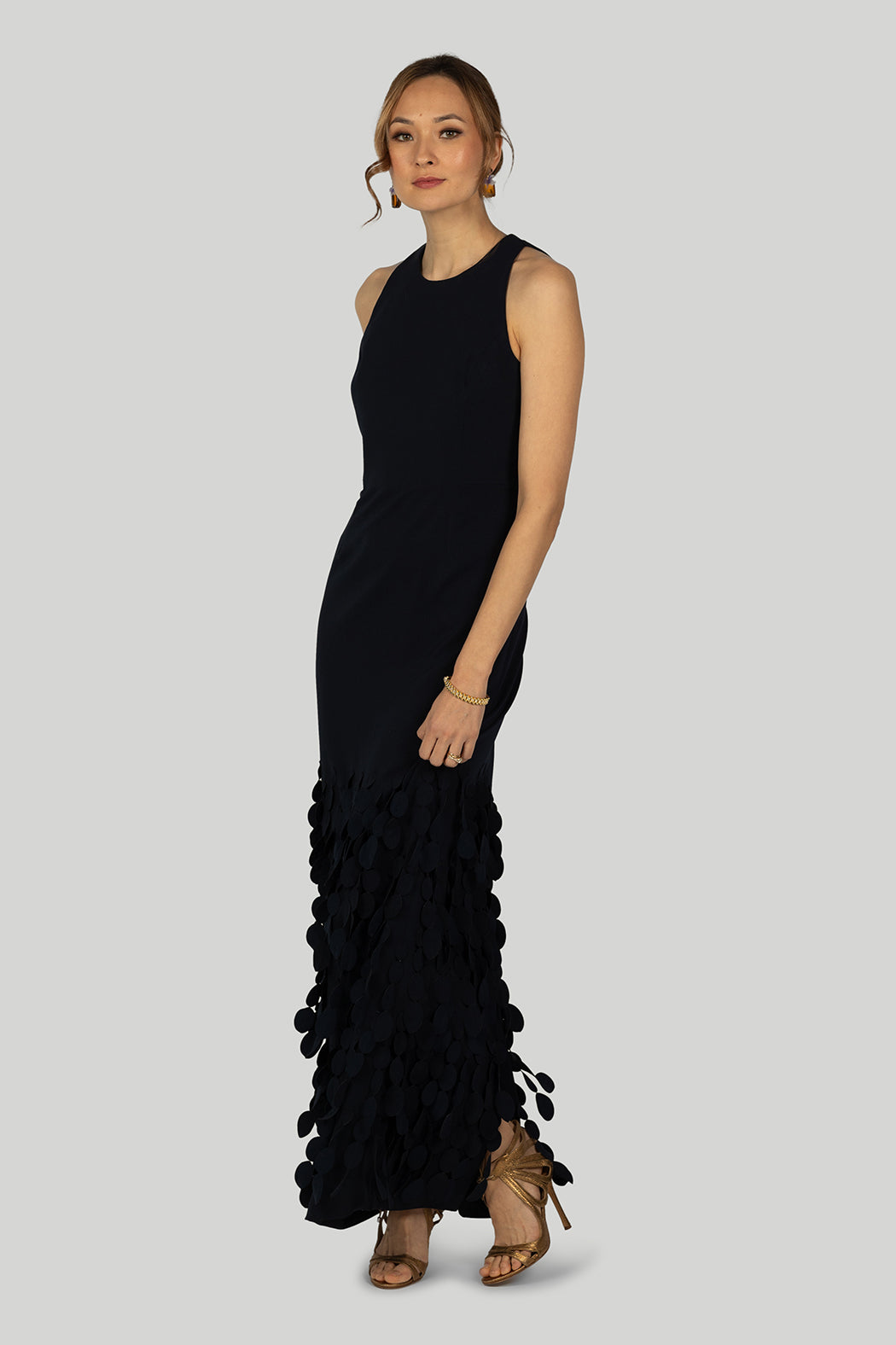 • Sleeveless, racer neck, boned waist, slim floor length skirt, slit at back, laser-cut small ovals on hem