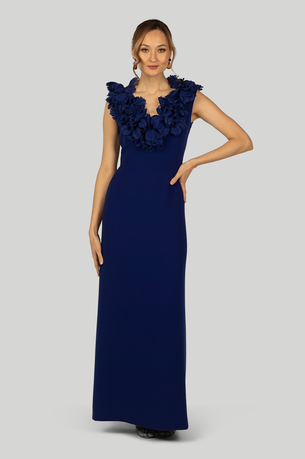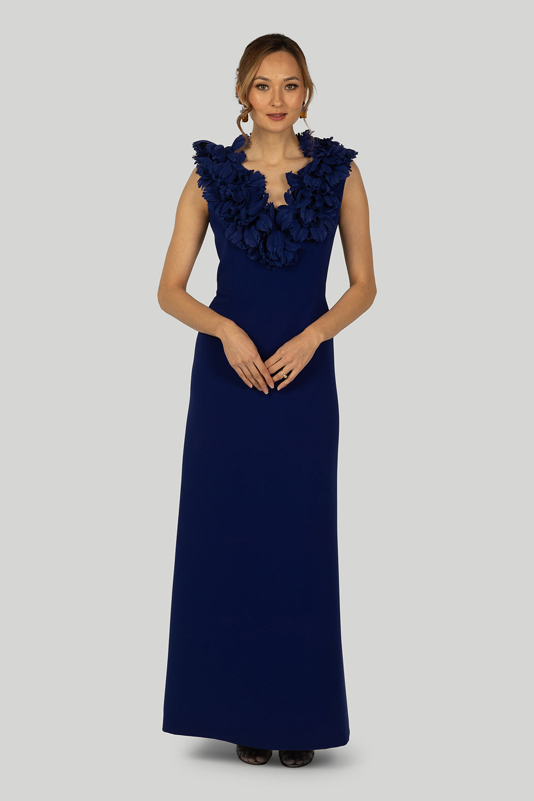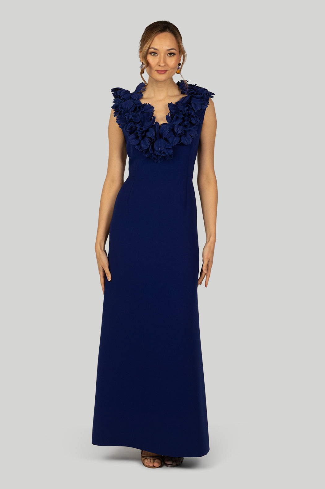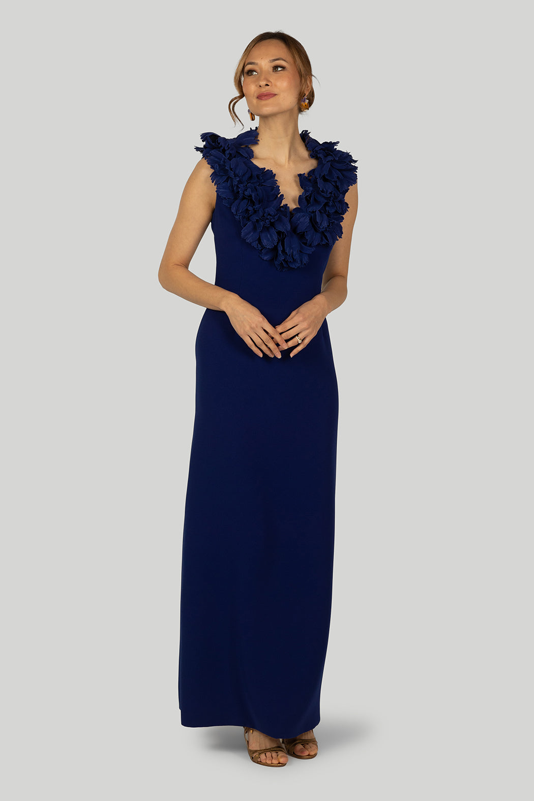 • V neck sheath gown, petals hand sewn on neckline, A-line skirt