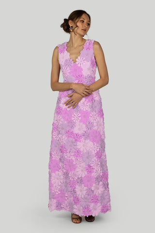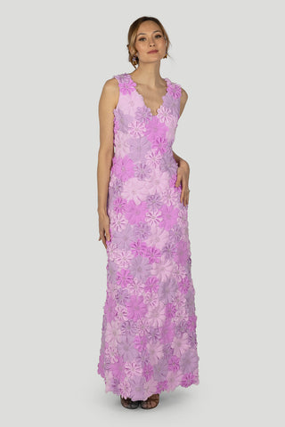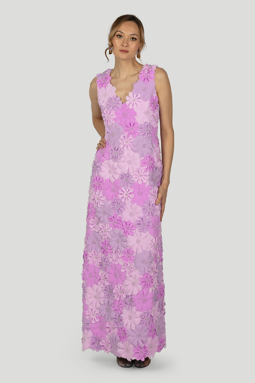 • V-neck, fitted bodice, individually hand-sewn ombré petal & crystal detail, A-line floor length skirt