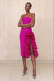 The Segros Dress is a striking fusion of structure and movement, featuring a sleek strapless silhouette and a cascading ruffle-trimmed slit. Expertly tailored for a flawless fit, it exudes modern sophistication with an avant-garde edge.
