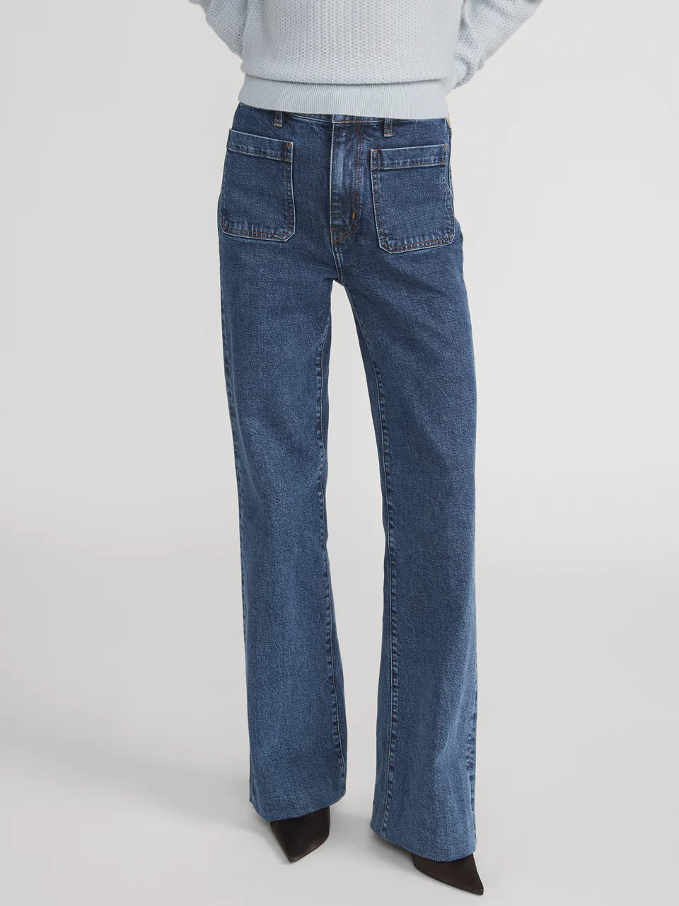 A '70s-inspired, high rise, wide leg jean with a sleek silhouette and patch pockets.