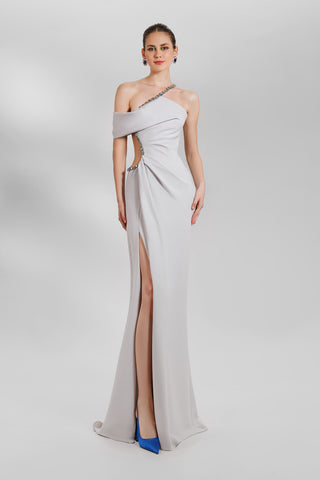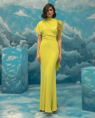 Striking colours, delicate fabric, and feminine form underline the essence of the Gemy Maalouf. Expressing a fresh approach to fashion, the bejeweled designs and rich beadings emanate female regency and sophistication in a modern, refined manner. An eclectic range exhibiting a variety of bold, bright colours and materials, the asymmetrical cuts create an edgy vibe whilst retaining the charm and distinct elegance consistent with the collection.