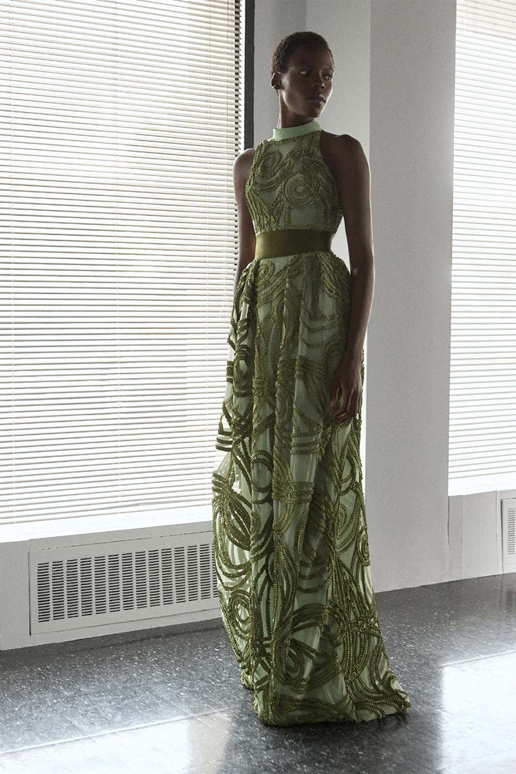 Sleeveless high-neck full-length gown with dimensional embroidery.