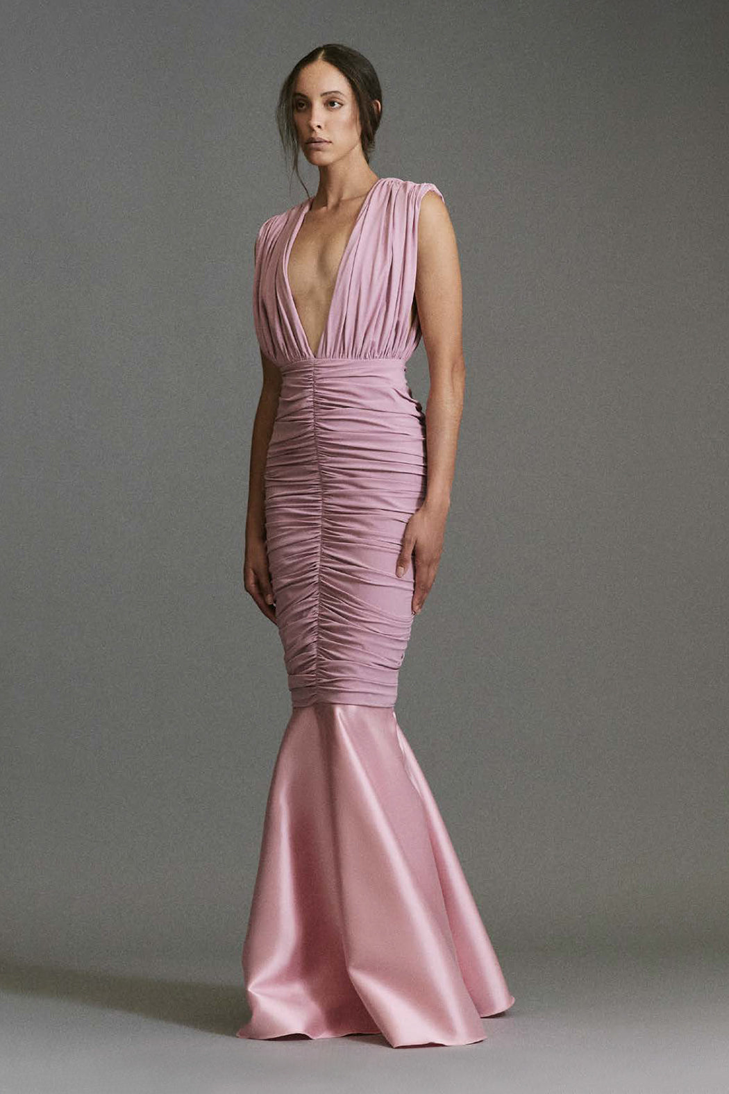 The Mergan Gown is a striking evening silhouette defined by its deep draped V-neckline and artful ruching through the bodice. The fitted shape contours the body before falling into a dramatic contrast flounce hem, adding fluid movement and refined glamour. Designed for formal occasions, this gown delivers confident, modern elegance.