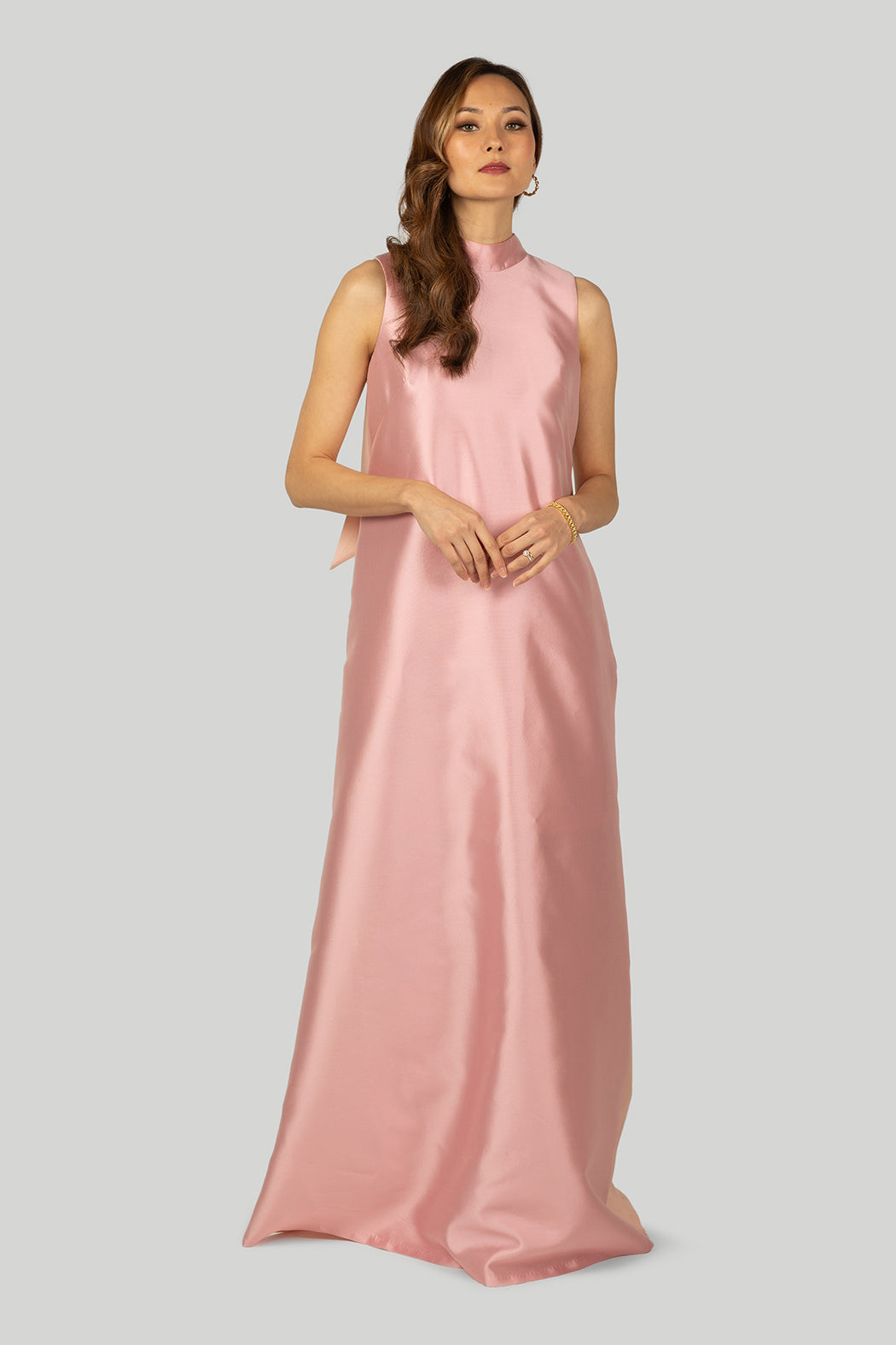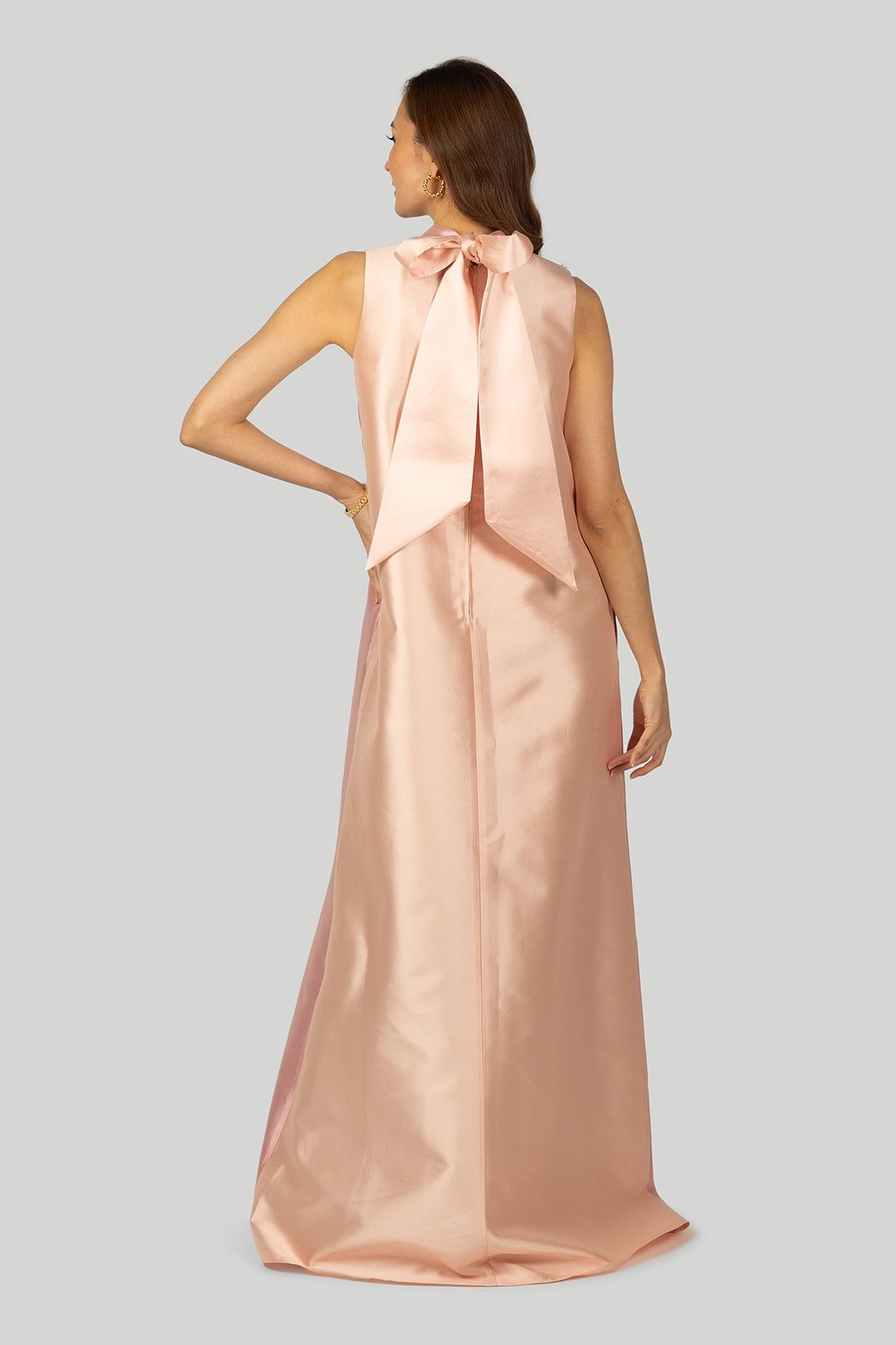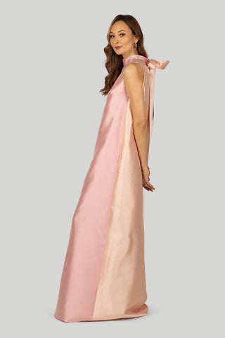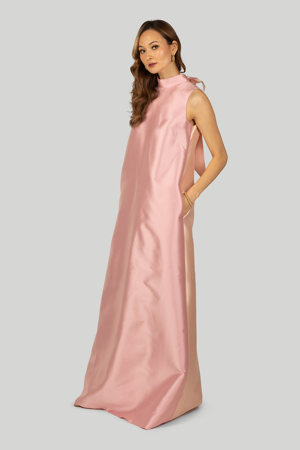 The Quiven Gown by Greta Constantine redefines minimalist elegance with its striking trapeze silhouette. Highlighted by a high neckline and subtle tie detailing at the back, this gown exudes modern sophistication while offering effortless wearability for any grand occasion.
