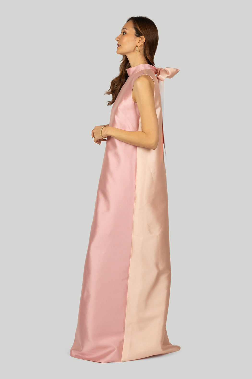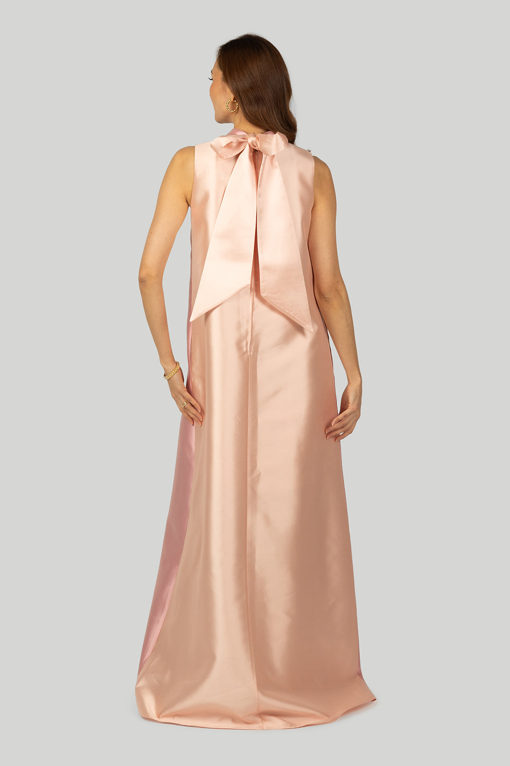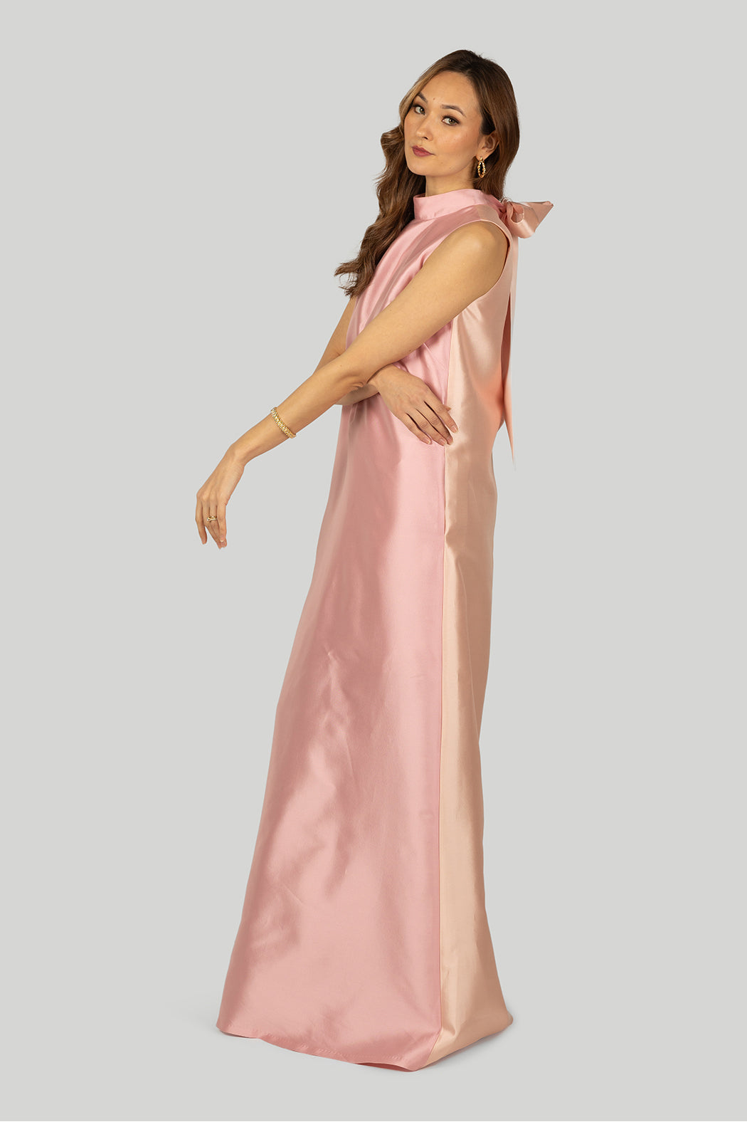 The Quiven Gown by Greta Constantine redefines minimalist elegance with its striking trapeze silhouette. Highlighted by a high neckline and subtle tie detailing at the back, this gown exudes modern sophistication while offering effortless wearability for any grand occasion.