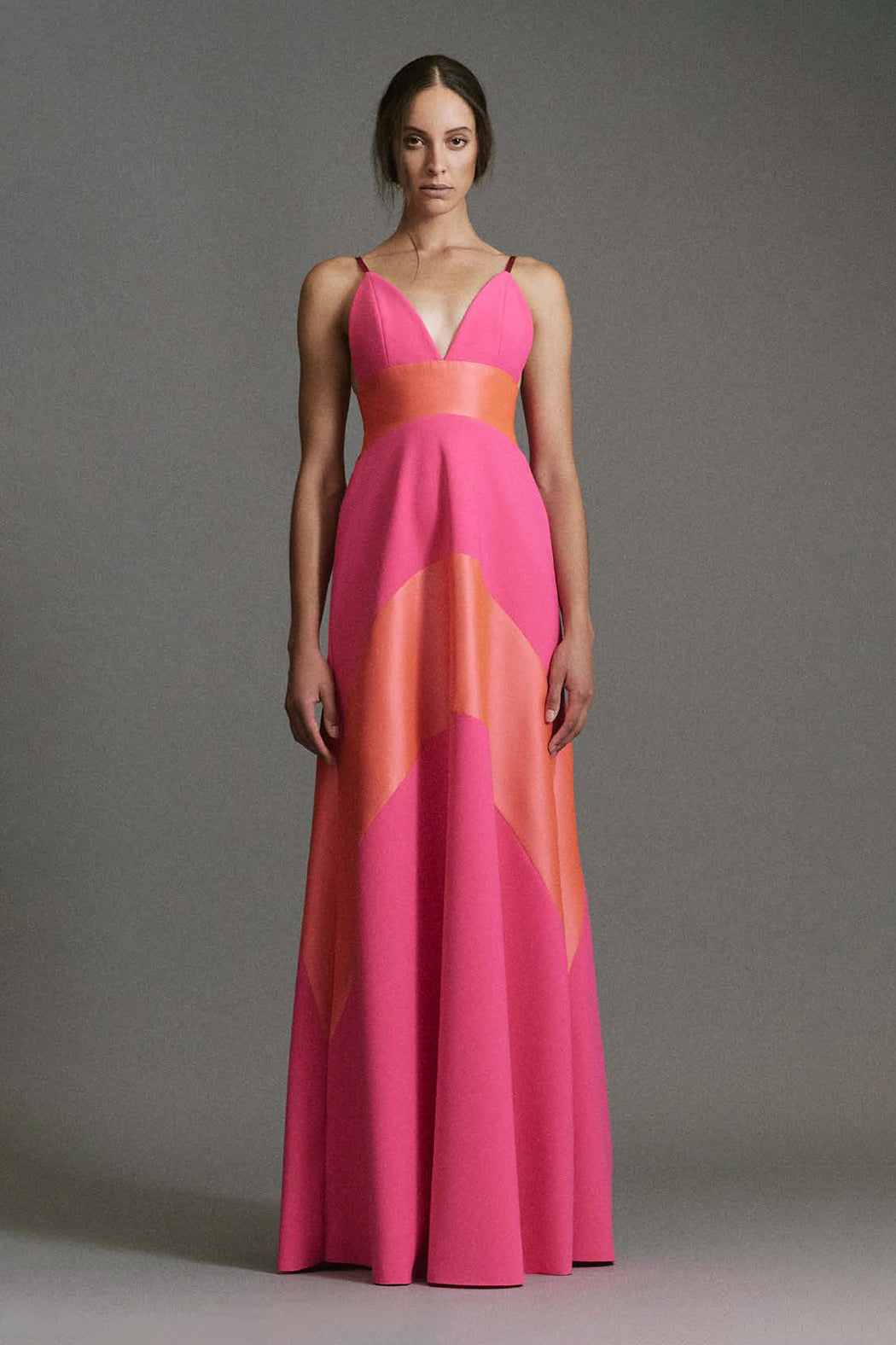 A floor-length gown with spaghetti straps and vibrant color-blocked panels that play with curves and movement.