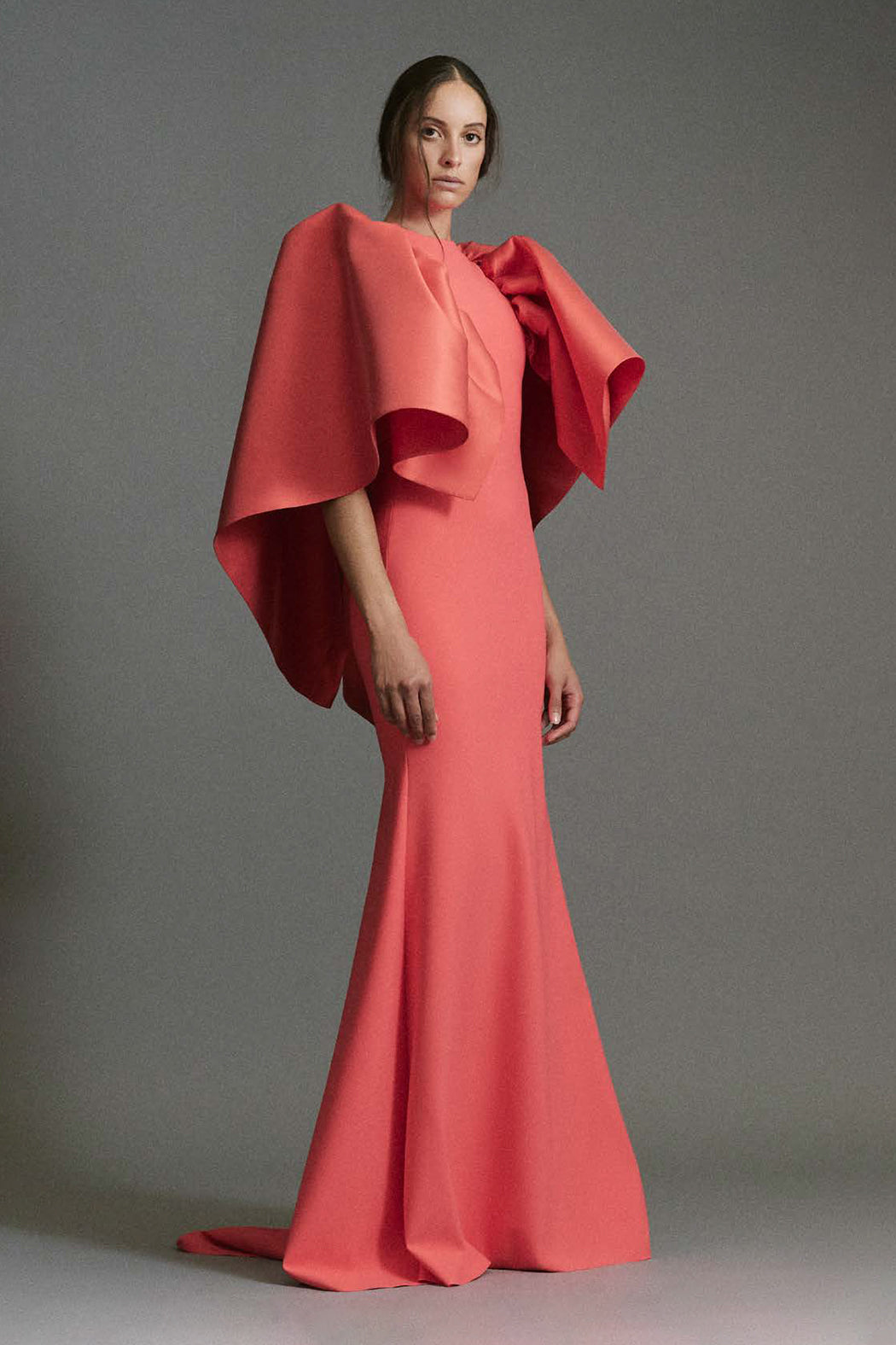 The Whimbrel Gown is a dramatic trompe l’oeil silhouette designed to command attention. A sculptural cape effect frames the shoulders with architectural volume, while the sleek fitted gown falls into an elegant train for striking movement. Bold yet refined, this statement piece is made for galas and black-tie occasions.