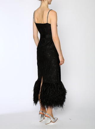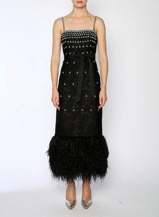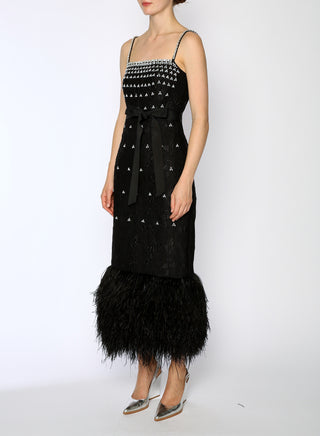Introducing the Huishan Zhang Astra Bustier Midi Dress, featuring crystal embellishments and feather adornments.