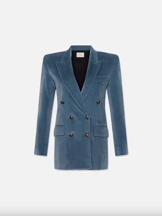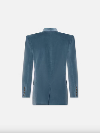 The Double-Breasted Slim Blazer is crafted from plush cotton velvet and features a deep lapel with gold contrast buttons which gives it an authentically vintage feel. Style it with the coordinating Slim Stacked Trouser for a retro-inspired power ensemble.