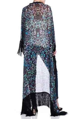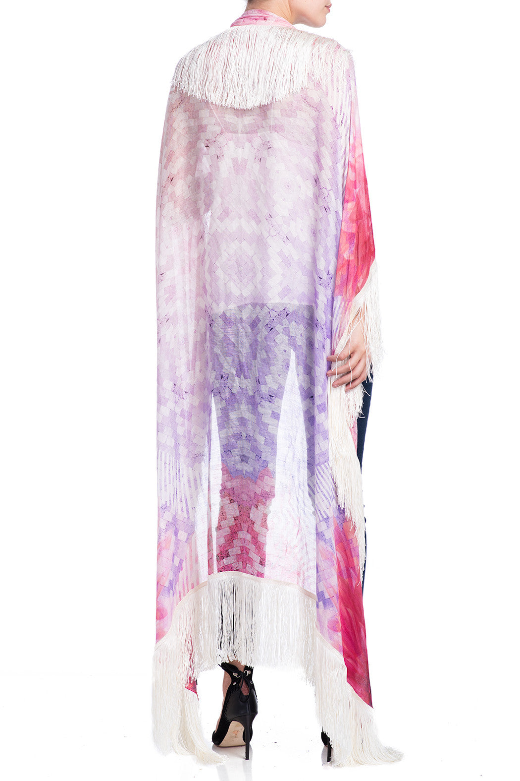 This Athena Procopiou fine-woven silk triangle shawl features soft pink and purple pastel features. Embellished with long white crochet fringe.