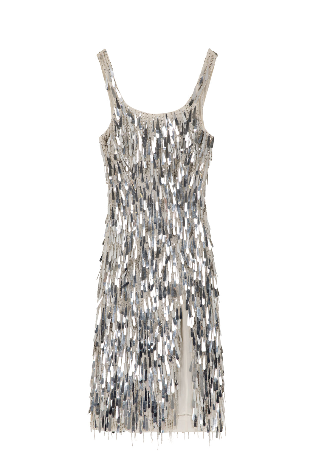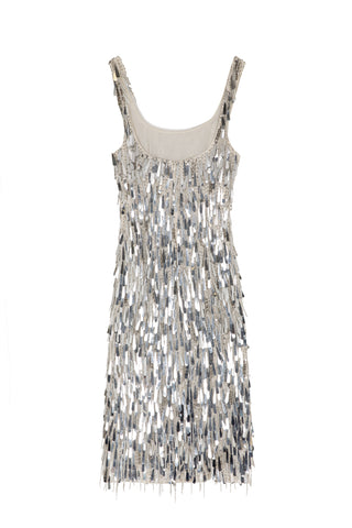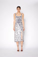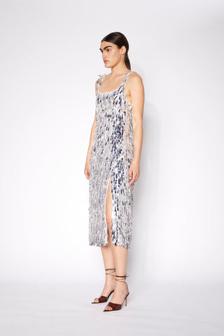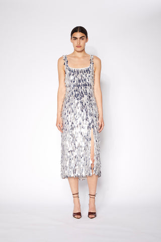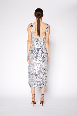 Reimagining our hero Zuki dress in a midi length, Emika is embellished with countless glossy black beads and sequins that sparkle in the light. Drenched in tiny star sequins, clusters of dangling teardrop shape paillettes, and strings of black beads, it shimmers as you move.  This show-stopper has a square neck, narrow straps, and thigh-high split, guaranteed to turn heads!