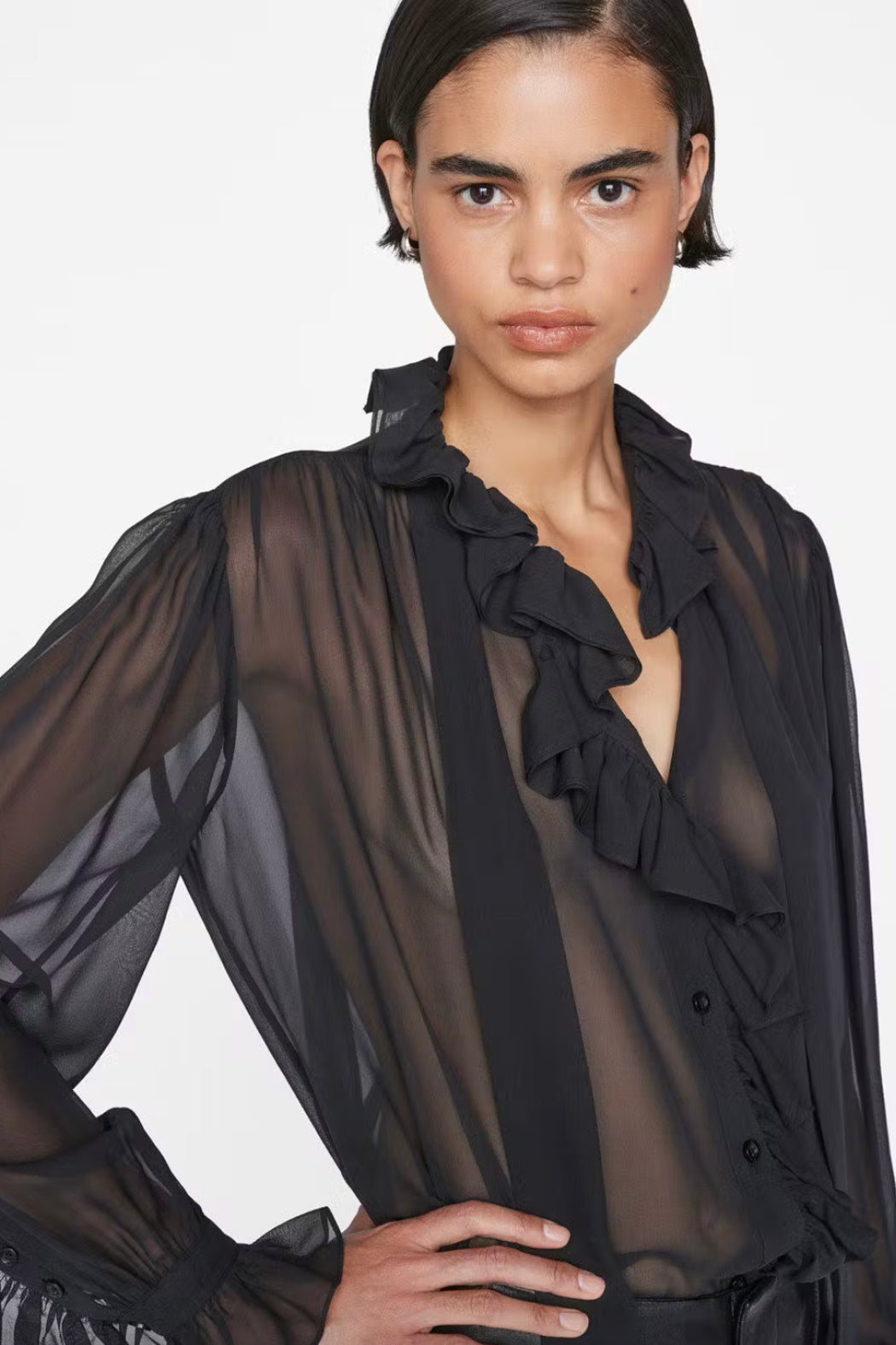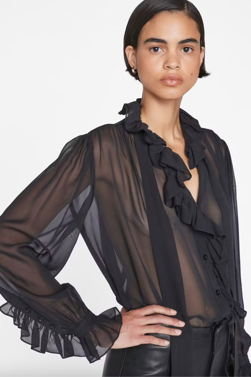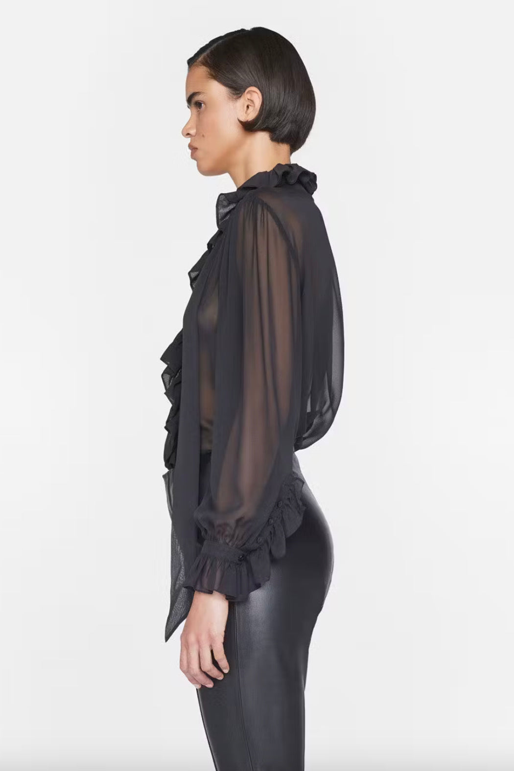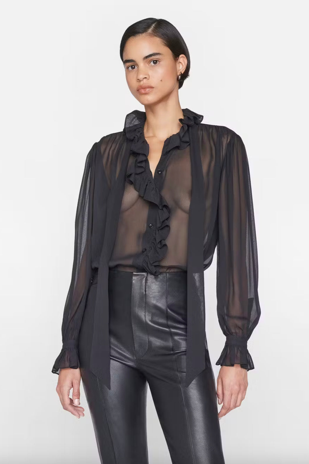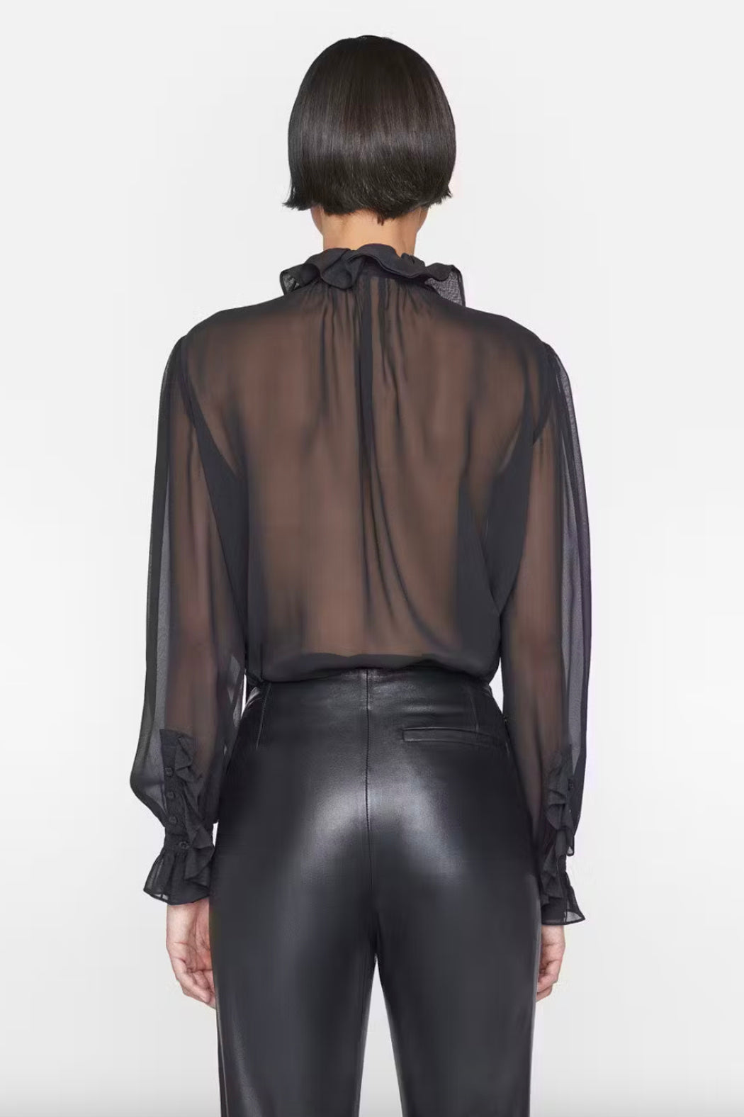 Achieve a polished look with this stylish Frame shirt. Crafted with luxurious 100% silk chiffon, it features a ruffled collar, long ribbon neck tie, button closure, and ruffle details at the front and cuffs. The draped silhouette with shirring gives it a flattering fit.
