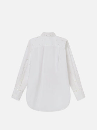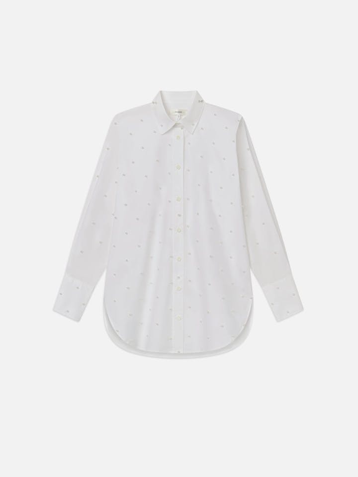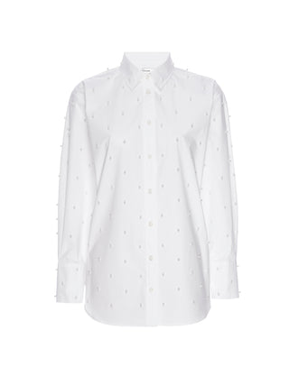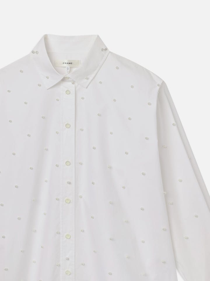 An introduction to the ultimate after-dark shirt: an oversized button-down with classic shirt collar, featuring pearl embellishments for added flair. Crafted from 100% organic cotton for a sustainable take on a luxurious staple.