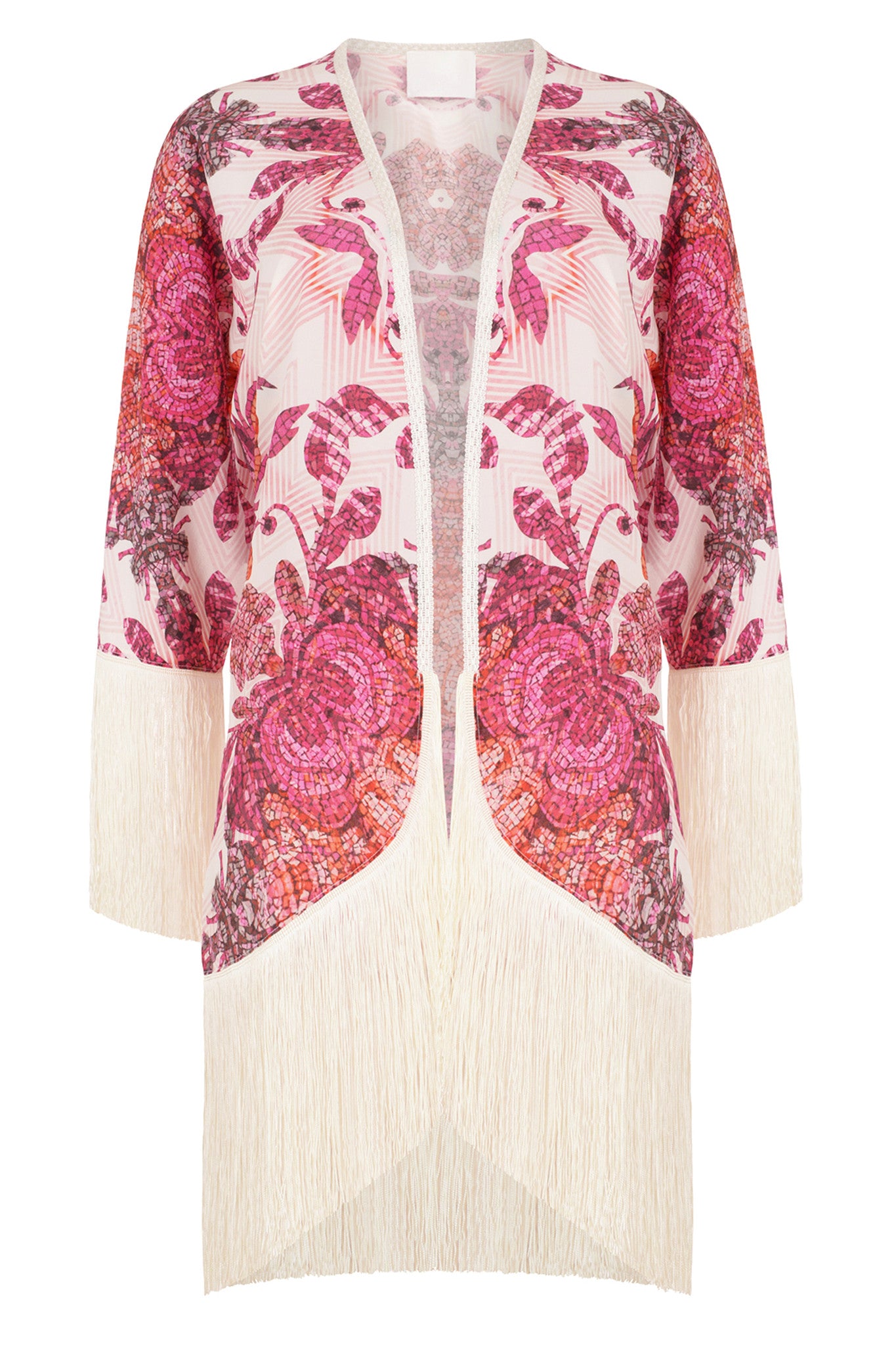 The route to an effortless wardrobe is made easy with a kimono; this Athena Procopiou style features a vibrant pink mosaic print with cream fringe trim on the arms and hem.