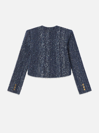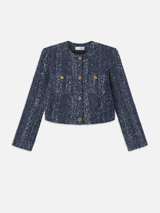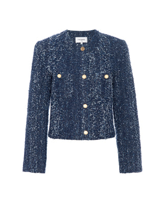 A fresh take on the classic suit jacket, this cropped collarless jacket is crafted from a textured denim boucle and cut to a boxy fit. It features light shoulder pads for structure, bracelet-length sleeves and chest pockets. It's fully lined and finished with gold hardware.