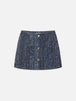 Crafted from a textured denim boucle, this tailored mini skirt features an A-line silhouette, and front gold button closure.
