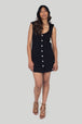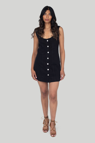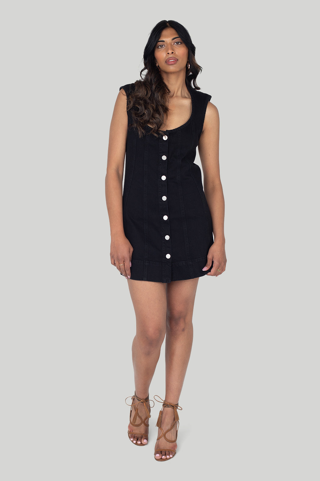 The Frame Seamed Scoop Dress in black is crafted from 100% cotton, featuring a front button closure and a scoop neckline. Unlined for a lightweight feel, this dress offers a sleek and minimalistic look, perfect for versatile styling from casual to evening wear.