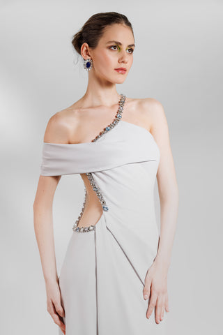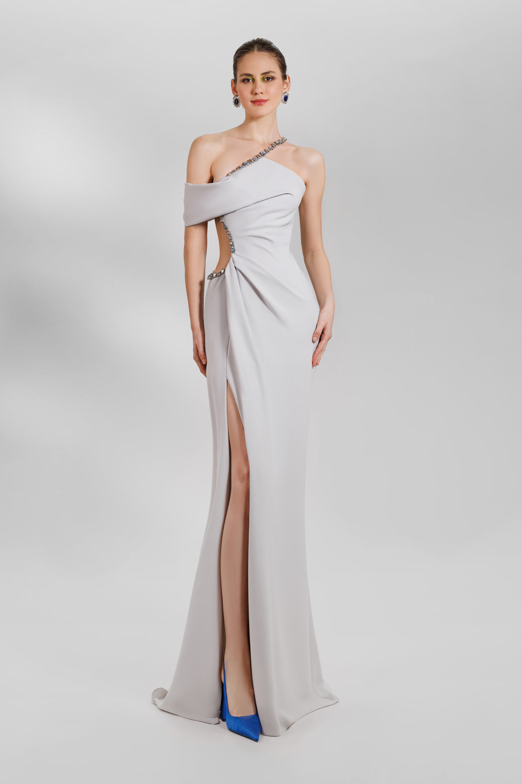 This long crepe asymmetrical neckline dress is featuring beadings on the neckline. This design has draping on the waist, an open side waist with beadings. A high side slit that made the slim cut silhouette, more appealing to the eye.