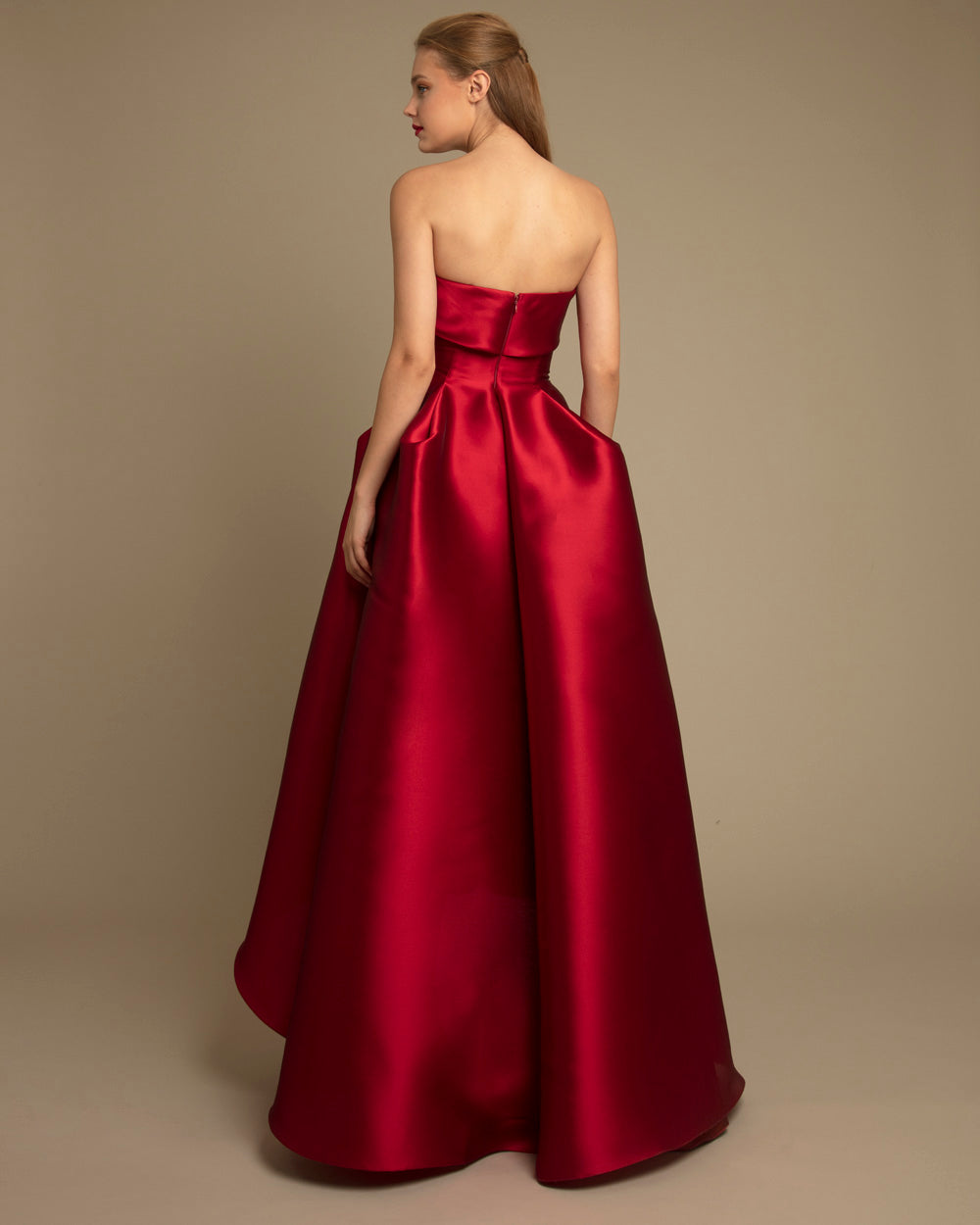 Strapless cut with pleating and structured details long dress comes in a laminated Mikado seta fabric. Gemy Maalouf does fit small. We recommend sizing up.