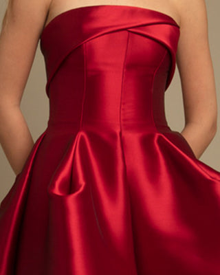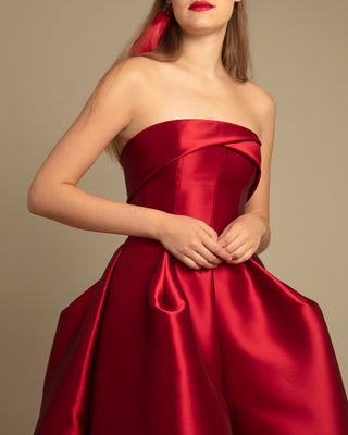 This elegant evening gown from Gemy Maalouf features a strapless cut and pleated design, perfect for a gala event. The stunning red color adds a bold touch to your look. Make a statement with this sophisticated dress.