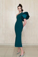 The Greta Constantine Amaryllis Dress features a striking asymmetrical neckline with an exaggerated flourish sleeve, creating a bold yet elegant look. This A-line gown balances a sleek silhouette with a dramatic statement sleeve, making it a standout choice for formal events and galas.
