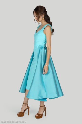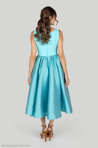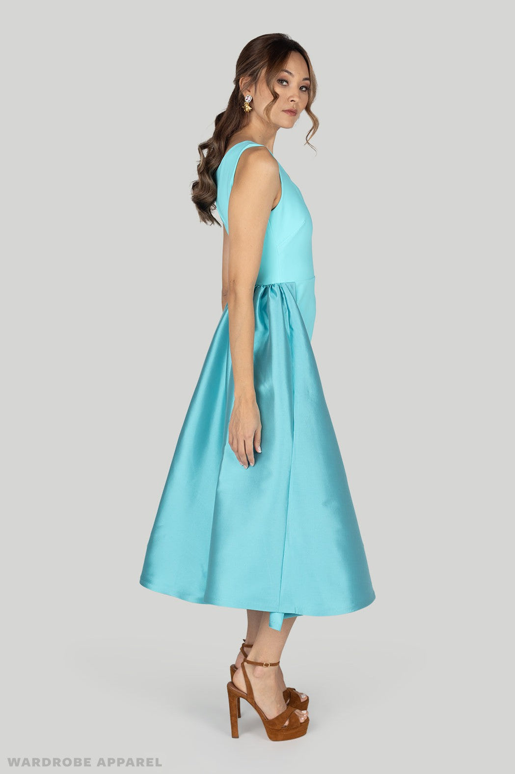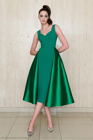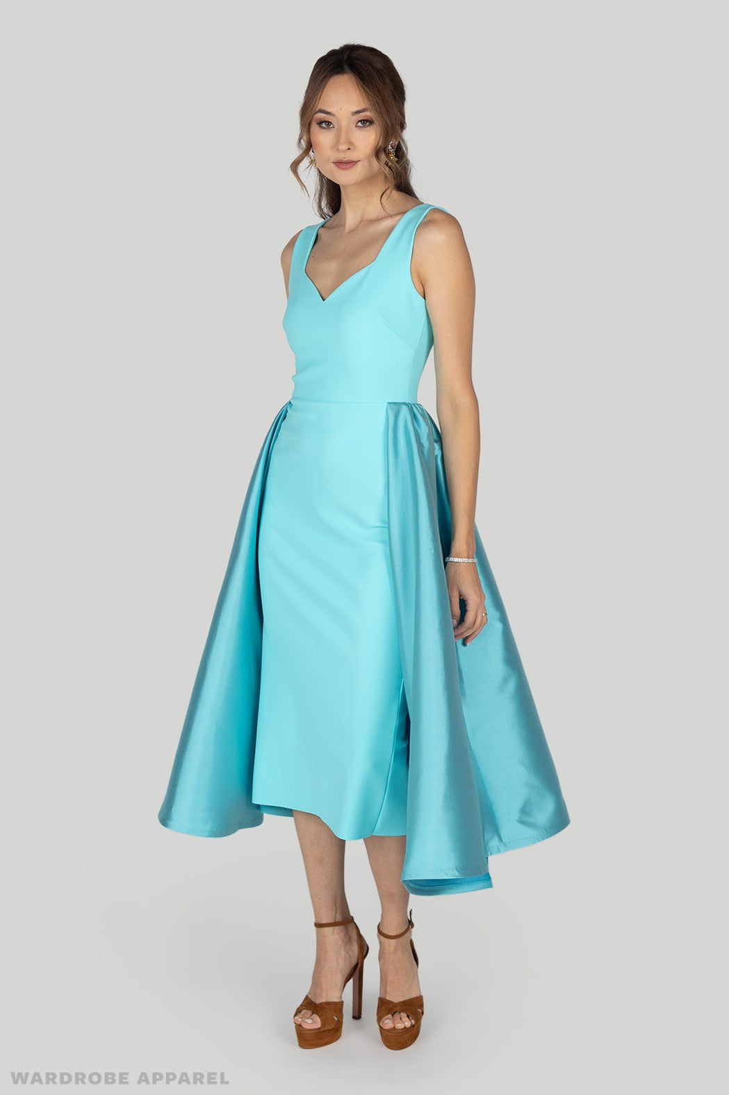 The Greta Constantine Celastrus Dress features a flattering sweetheart neckline and a fitted bodice, complemented by a dramatic overskirt that adds volume and movement. This elegant dress combines classic lines with a modern twist, making it a standout choice for formal occasions and special events.