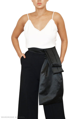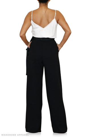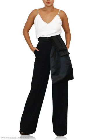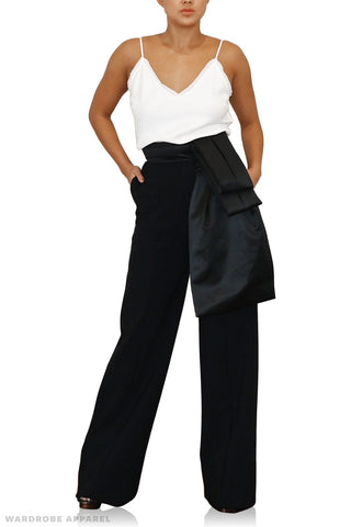This wide leg trouser with a luxurious satin tie at the waist from Canadian Designer Greta Constantine will make your legs look a mile long, and cling in all the right places.