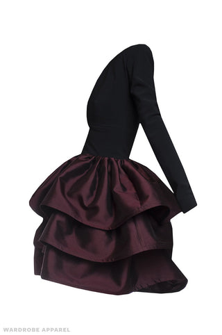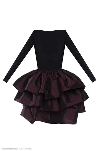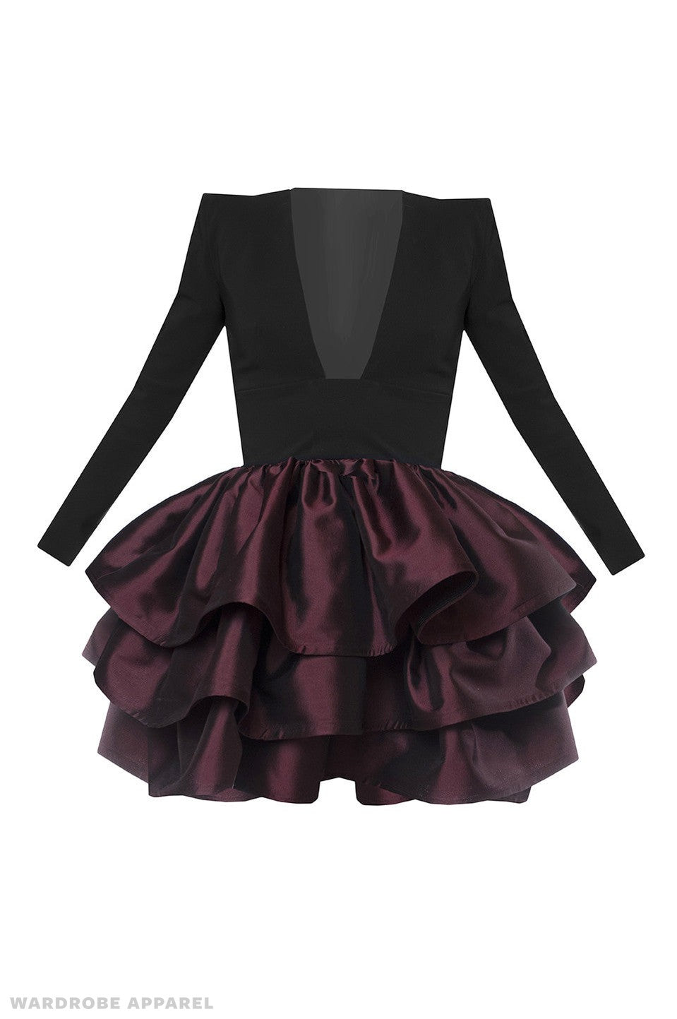 Greta Constantine The Trixie Dress is a full sleeve party dress with a plunging v-neckline and cinched waist. Featured a 3 tiered skirt with lots of volume. Zipper closure at back.