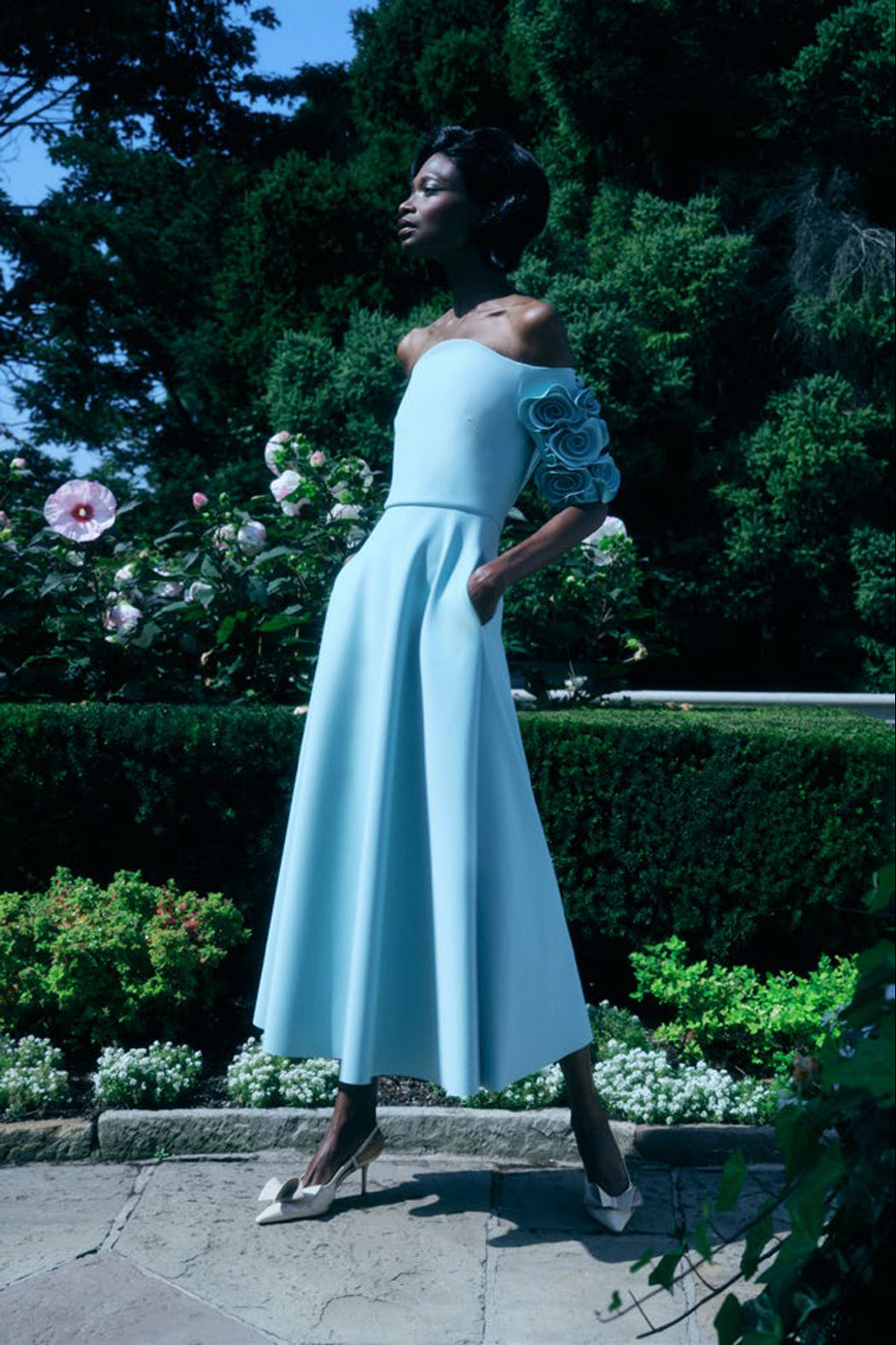 The Tschumi Dress is a study in graceful structure, featuring an across-the-shoulder neckline and sculpted rosette-appliqué sleeves. Its impeccably tailored A-line midi silhouette exudes timeless sophistication with a modern, feminine edge.