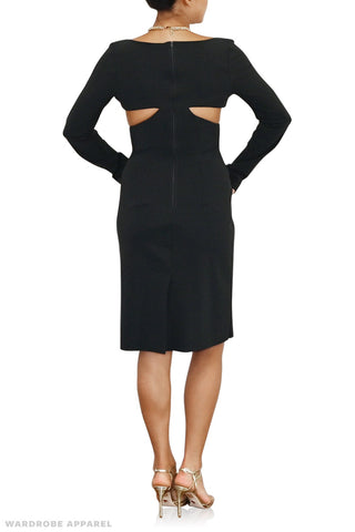 Greta Constantine the Vesnite Dress has long sleeves and features side cutouts at the ribs and a v neckline. Zipper closure at back.