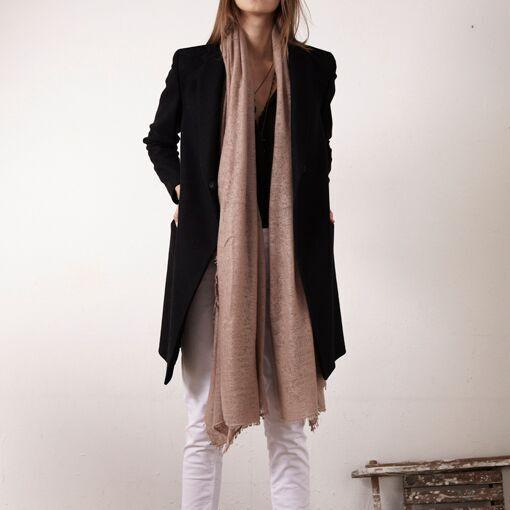 This Jane Carr ultra-fine cashmere blanket scarf, suitable for both warm and cool climates. Hand frayed hems.