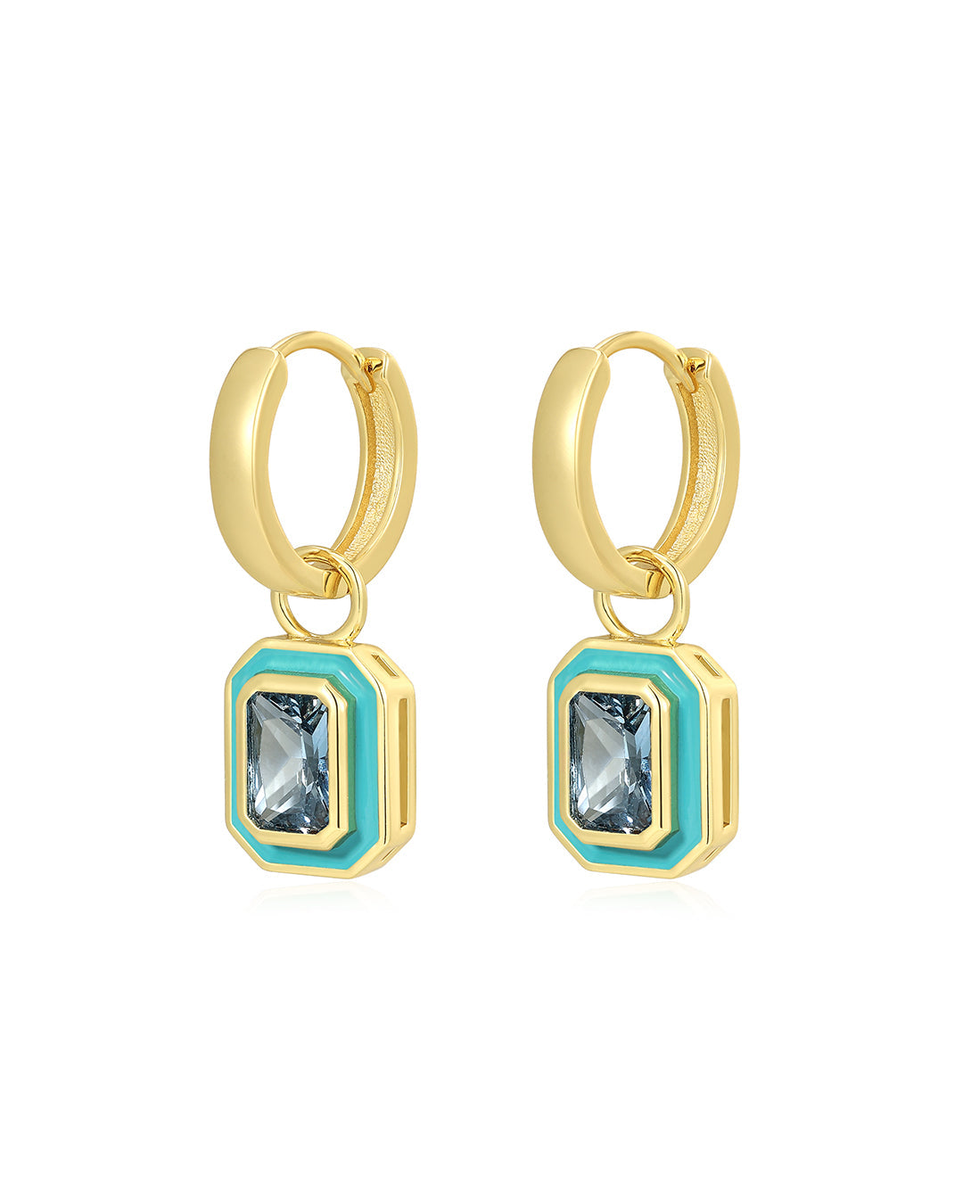 These hoops feature an emerald-shaped charm with aazore colored center stone, accented by a turquiose blue enamel trim. The elegant design adds a touch of sophistication to any look, making them perfect for both casual and formal occasions.